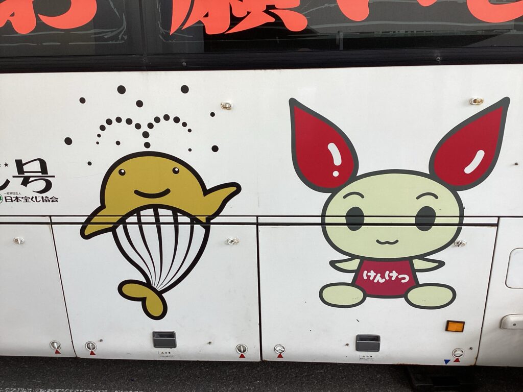 献血バス「宝くじ号」とともに