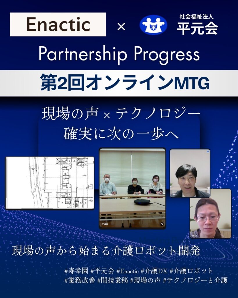 特別養護老人ホーム寿幸園では、株式会社Enactic(エナクティック)様と進めている介護助手ロボット開発プロジェクトの一環として、第2回オンラインミーティングを実施しました。